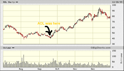 Lesson 3. (chart) SIGNAL was KICK. We tested it on AOL on Tue 9/21/99 4:41 PM (after market close). If you are able to recall, AOL closed at 85 or so on that day and that was THE FIRST DAY OF� AOL's CURRENT BULL RUN which has taken it from 85 to 140 level today. (See this on the chart of AOL)