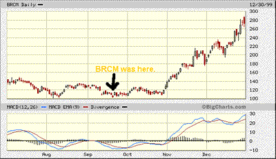 Lesson 4. Jump. Sept 22, 1999. Thank God, (Oh no, Thank AOL), you gave a good example for KICK by closing at 90+ today. (up by more than 5 dollars). Today it is a turn of BRCM to be used as an example for a new exercise. If you remember, a bearish outlook was taken on BRCM based on its chart around 128. Today it has closed at 113. If any one of you is really short on it, I would advise you to cover the short position (I would resist the temptation to initiate a long position in it for certain reasons). Ideally, BRCM could have been bought today at around 109 as soon as it opened for trading.